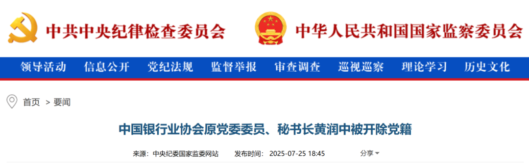 据中央纪委国家监委驻国家金融监督管理总局纪检监察组、福建省纪委监委消息:日前,经中央纪委国家监委批准,中央纪委国家监委驻国家金融监督管理总局纪检监察组、福建省泉州市监委对中国银行业协会原党委委员、秘书长黄润中严重违纪违法问题进行了纪律审查和监察调查。