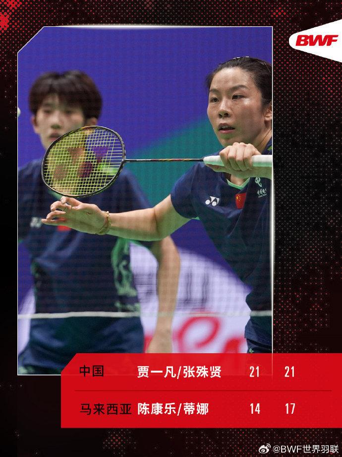 此前在女双半决赛第一场中,贾一凡/张殊贤2-0(21-14/21-17)战胜陈康乐/蒂娜率先挺进决赛,国羽会师决赛锁定冠军。