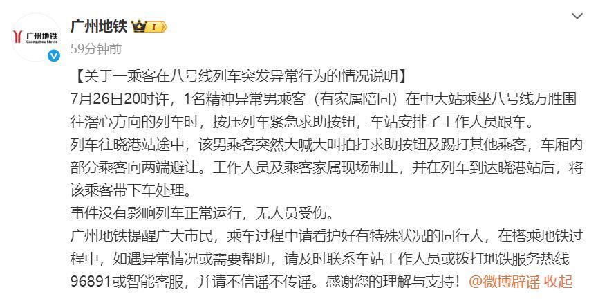 7月27日,@广州地铁 发布《关于一乘客在八号线列车突发异常行为的情况说明》。