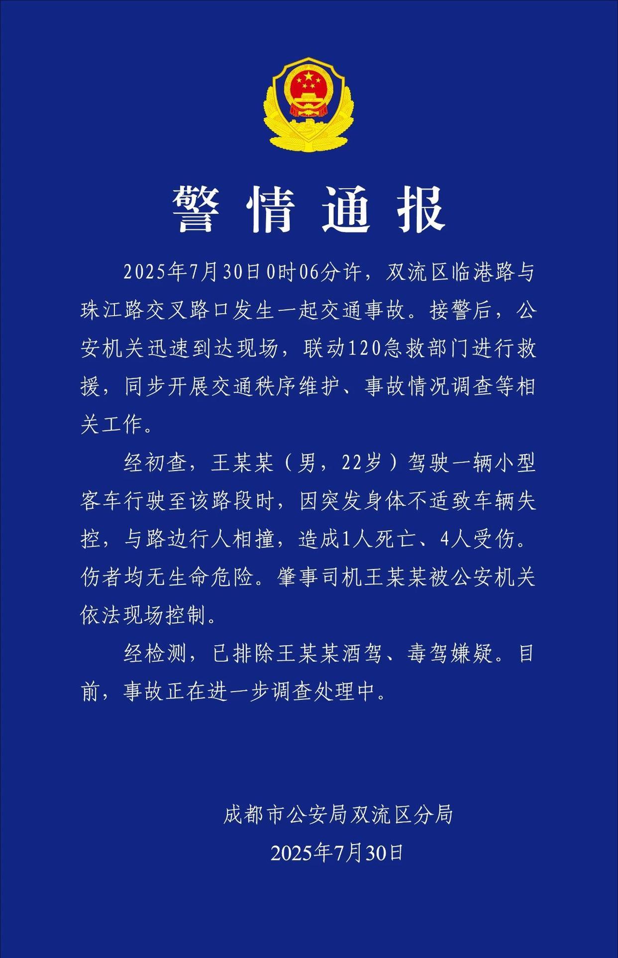 经初查,王某某(男,22岁)驾驶一辆小型客车行驶至该路段时,因突发身体不适致车辆失控,与路边行人相撞,造成1人死亡、4人受伤。伤者均无生命危险。肇事司机王某某被公安机关依法现场控制。