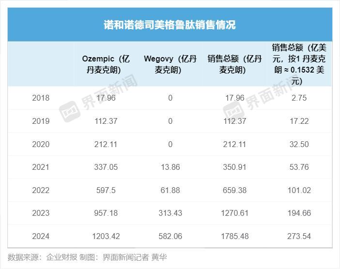 据界面新闻记者统计,在2018年-2024年期间,这一产品的销售额(注:此处指Ozempic和Wegovy的销售总额)从17.96亿丹麦克朗涨到1785.48亿丹麦克朗,大约是从2.75亿美元涨到273.71亿美元。也就是,7年间,产品销售额涨幅接近10000%。