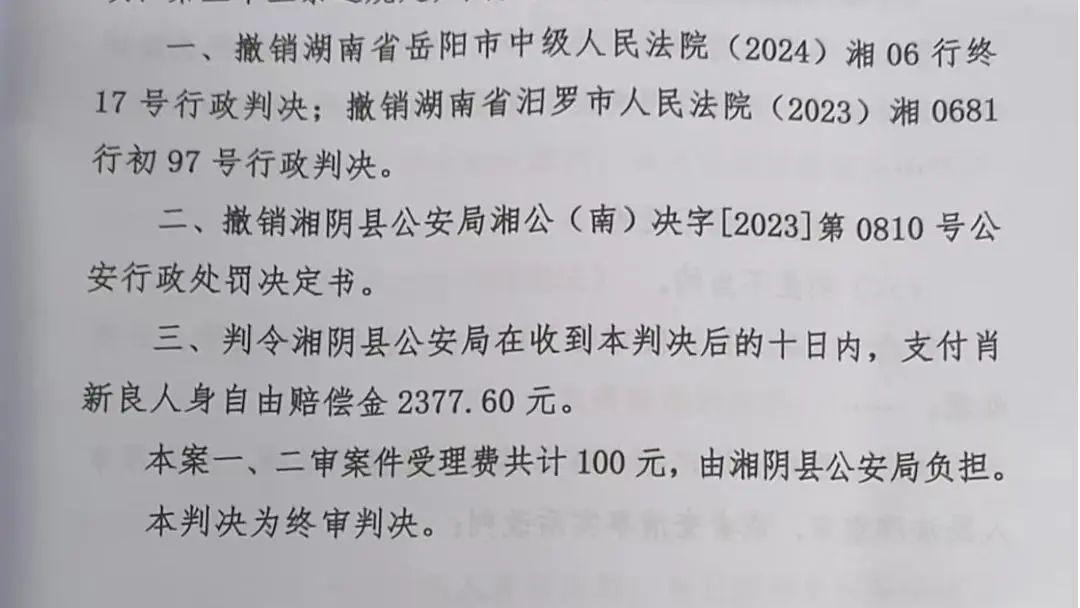 2025年6月25日,49岁的湖南湘阴人肖新良拿到了一份期待已久的判决,这份判决撤销了他曾接受的行政拘留处罚。