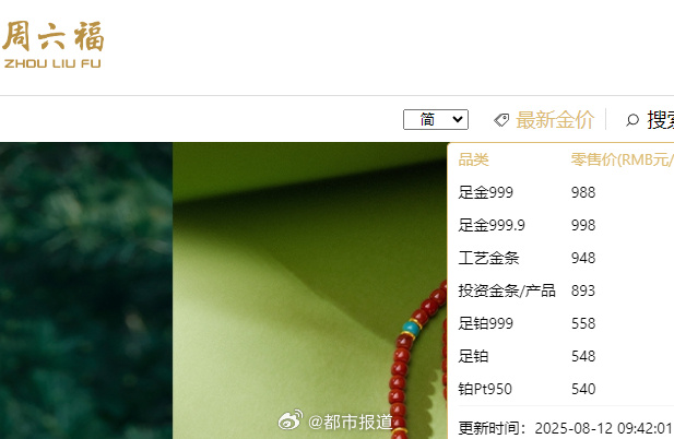 8月12日,记者查询发现,今日周生生金饰品克价跌至1010元,周大福金饰品克价跌至1008元,老庙金饰品克价跌至1004元,周六福金饰品克价跌至988元。