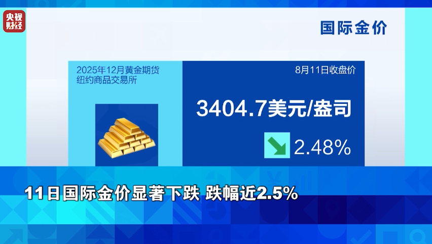 国际金价方面,美国总统特朗普周一在社交媒体上发文称,“黄金不会被征收关税”,令投资者担忧情绪降温。同时,市场普遍预计美国关税政策引发的物价上涨,将推动美国7月CPI数据进一步反弹,通胀压力加剧或影响美联储降息路径,以上因素导致国际金价周一大跌近2.5%,创下近3个月来最大单日跌幅。截至收盘,纽约商品交易所12月黄金期价收于每盎司3404.7美元,跌幅约为2.48%。
