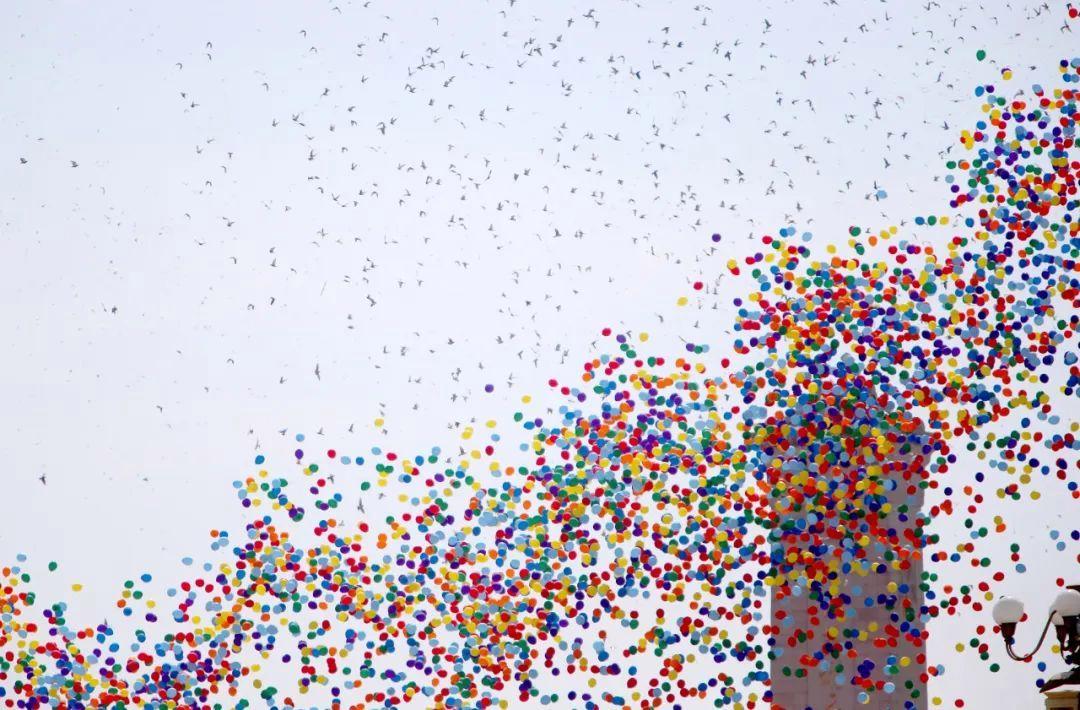 2015年9月3日,中国人民抗日战争暨世界反法西斯战争胜利70周年纪念大会在北京隆重举行。这是纪念大会现场放飞气球和白鸽。新华社记者 张加扬 摄