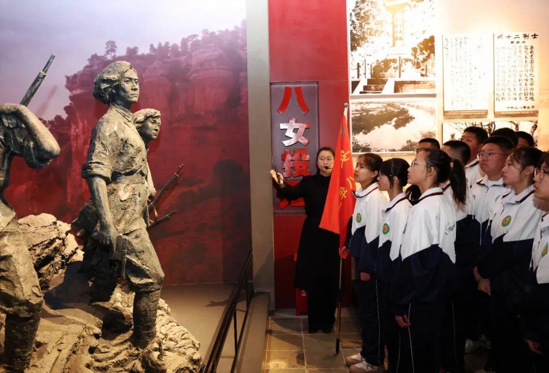 抗联中学学生在东北抗联史实陈列馆听讲解员讲述八女投江的故事。新华社记者 李钢 摄