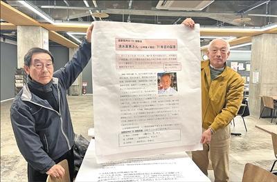 原英章(左)和竹上胜利向记者展示未被饭田市和平祈念馆采用的清水英男证言。