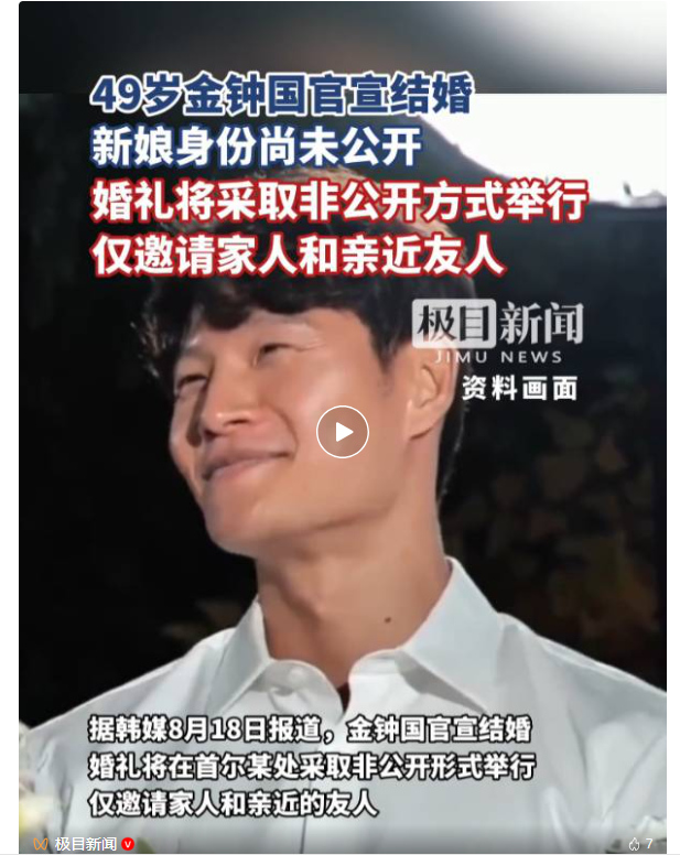 当地时间8月18日,韩国歌手金钟国官宣结婚。婚礼将在首尔某处采取非公开形式举行,仅邀请家人和亲近的友人。经纪公司表示:“在出道30周年这一有意义的年份迎来新的起点,更加特别而有意义。希望大家能以温暖的心意给予支持与祝福。”