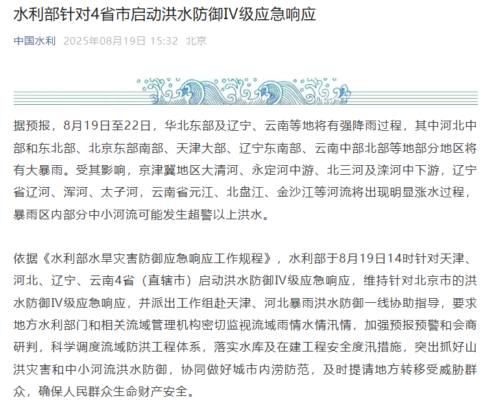 依据《水利部水旱灾害防御应急响应工作规程》,水利部于8月19日14时针对天津、河北、辽宁、云南4省(直辖市)启动洪水防御Ⅳ级应急响应,维持针对北京市的洪水防御Ⅳ级应急响应,并派出工作组赴天津、河北暴雨洪水防御一线协助指导,要求地方水利部门和相关流域管理机构密切监视流域雨情水情汛情,加强预报预警和会商研判,科学调度流域防洪工程体系,落实水库及在建工程安全度汛措施,突出抓好山洪灾害和中小河流洪水防御,协同做好城市内涝防范,及时提请地方转移受威胁群众,确保人民群众生命财产安全。