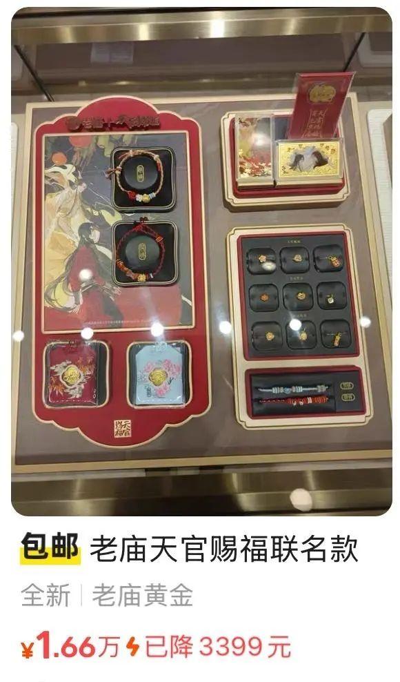 另一款由老庙黄金与《天官赐福》联名的金饰套装,近日也在二手平台被炒至1.66万元,吸引上万人浏览及点击想要;该卖家告诉九派财经记者,全套产品克重约11克。以此估算,单价也达到1509元/克。