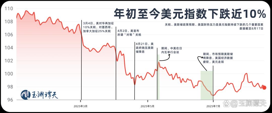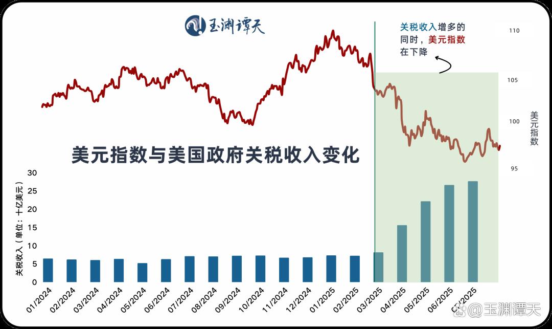 然而,关税的财政收益并未转化为货币强势——就在美国凭借关税大获收入的同时,美元却在持续走弱。