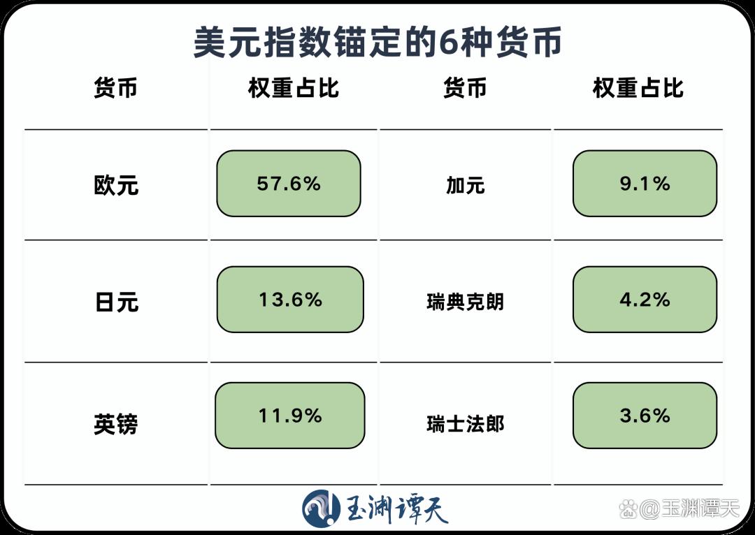 美元指数诞生于1973年,是美元相对于其他六种主要货币的加权汇率。其中欧元权重最大,为57.6%,接下来依次为日元、英镑、加元、瑞典克朗和瑞士法郎。