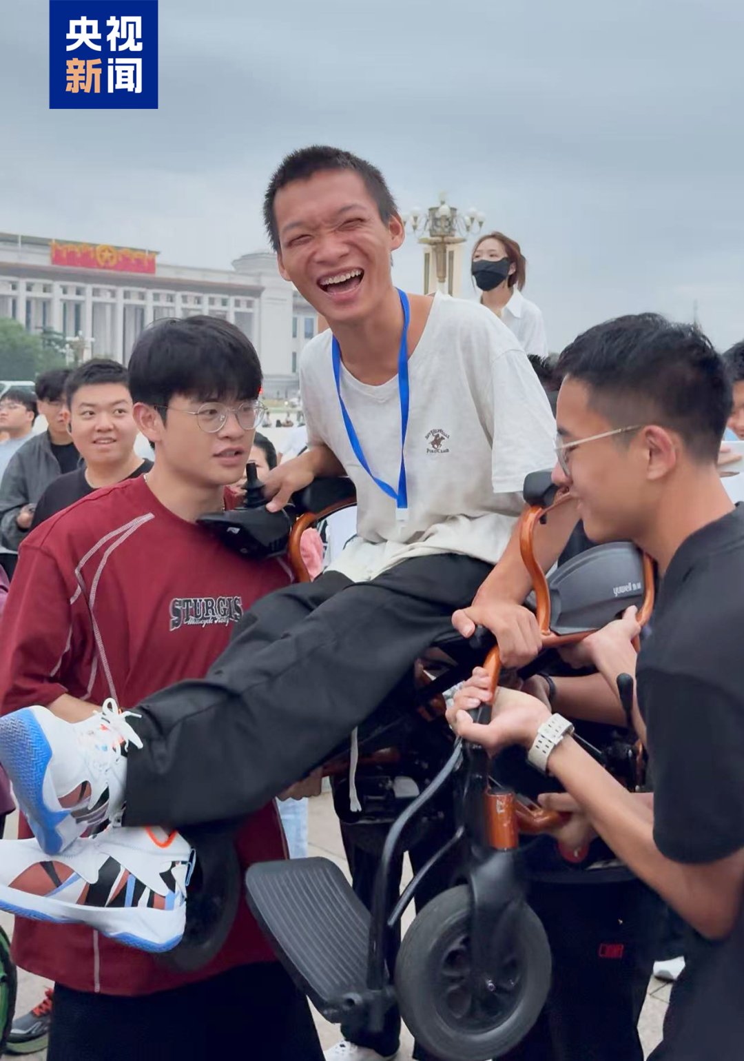 来自江西上饶的小龙,因患脑瘫自幼与轮椅为伴,他一直有个梦想:去北京看升旗。今年8月,小龙终于和朋友来到北京。看升旗那天,他们凌晨3点就起床前往天安门广场,但现场仍有比他们早到的观众,小龙和朋友努力往前挤,只抢到了中间的位置,坐在轮椅上的小龙视线也被人群遮挡。正当他感到无助之际,旁边一位素不相识的小伙站了出来。