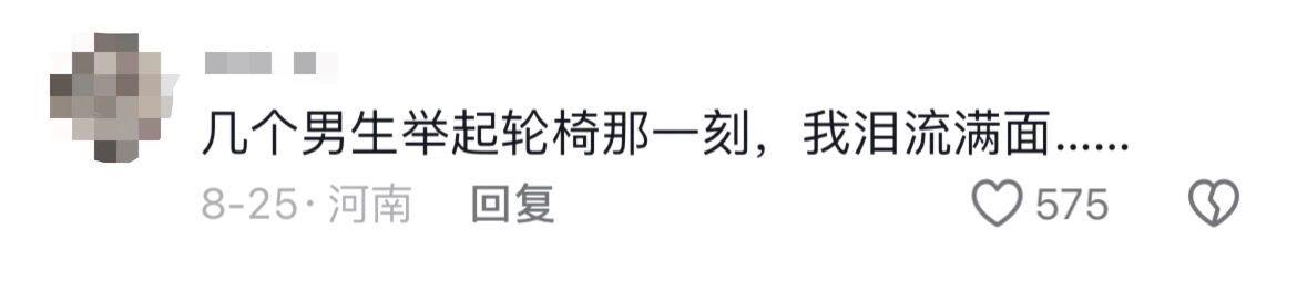 4个小伙举起轮椅的一幕感染了周围的观众,人群中传来欢呼声和鼓掌声。对于自己的善举受到关注,郑家磊说:“这种善举像阳光一样,可以照亮并温暖他人。其实很多人都想帮助小龙,我只是刚好在他旁边,换成任何一个人,可能都会做这件事情。”不少网友为郑家磊和3个小伙点赞,“成全了一个人,快乐了一群人,温馨了全网的人。”