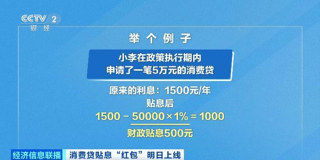 举个例子,在政策执行期内,小李申请了一笔5万元的消费贷,年利率是3%,还款方式为先息后本。他装修、买家电,把这5万元都花完了,就可享受年化1个百分点的贴息,原本一年要支付1500元的利息,他自己只要付1000元,另外500元,则由财政贴息资金替他负担。