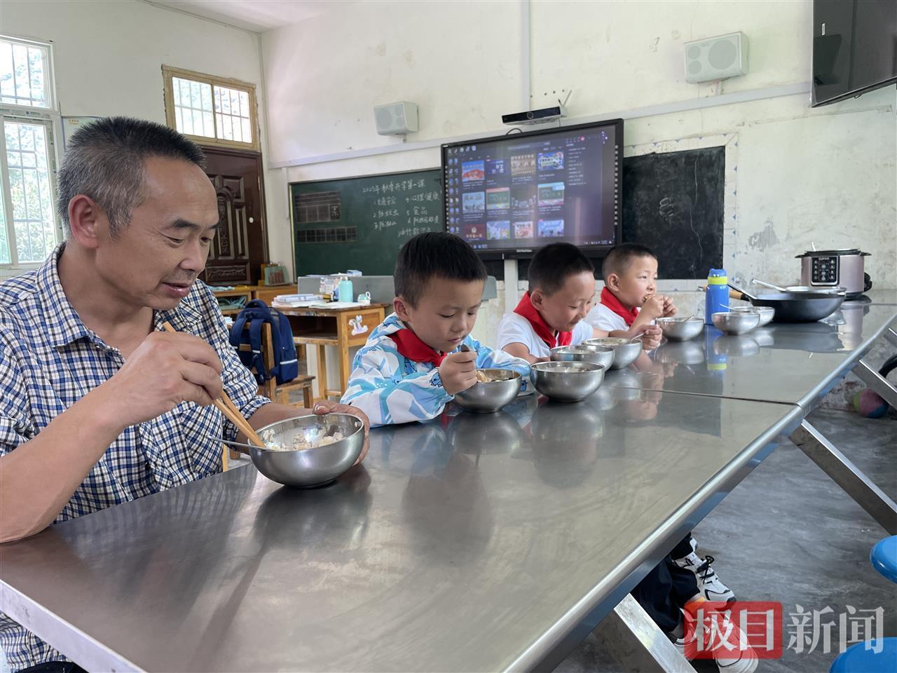中午时分,食堂阿姨送来了午餐:牛肉炒豆芽、土鸡烧土豆干、炒菠菜。师生四人一起吃饭,孩子们吃得津津有味。“每天不重样,要保证营养。”李西年笑着说。
