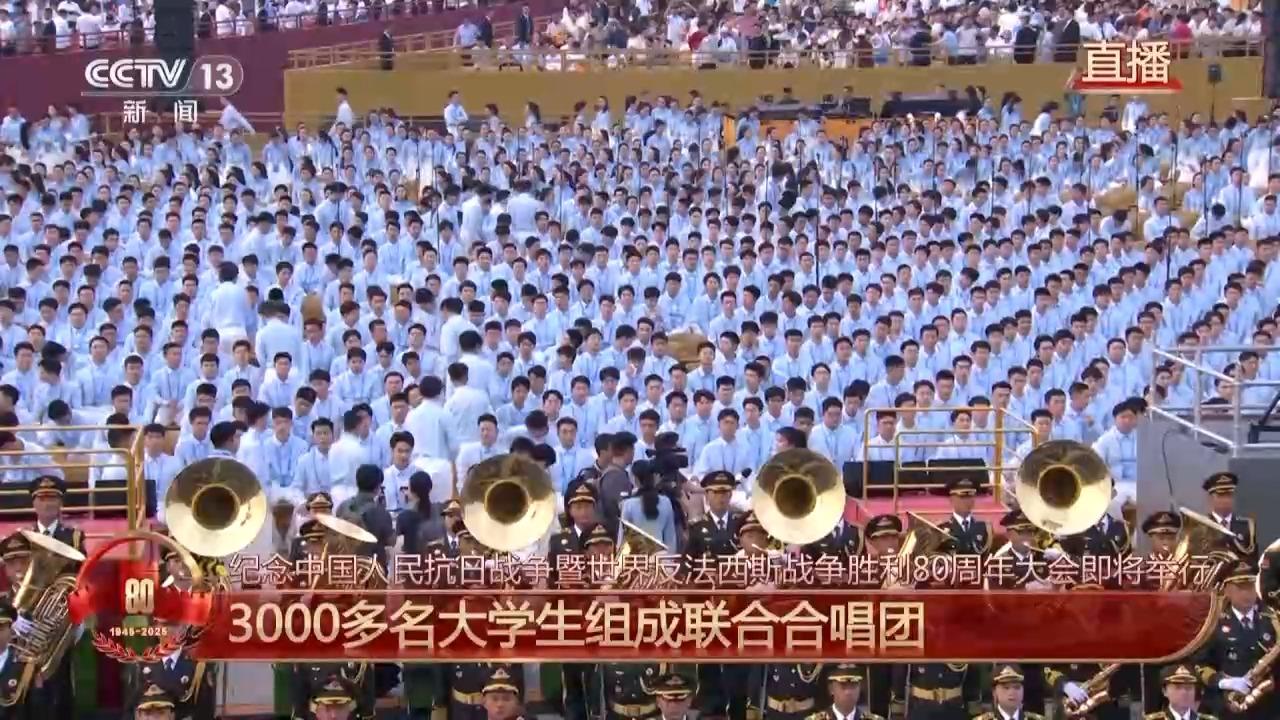 在今天的纪念大会开始前,来自北京40所高校的3000多名大学生组成的联合合唱团,会在军乐团的伴奏下连唱多首歌曲——《松花江上》《在太行山上》《保卫黄河》等,都是广为流传的抗战经典曲目和具有鲜明时代特征的歌曲,目的就是要带大家一起重温抗战历史,展现众志成城的民族精神。