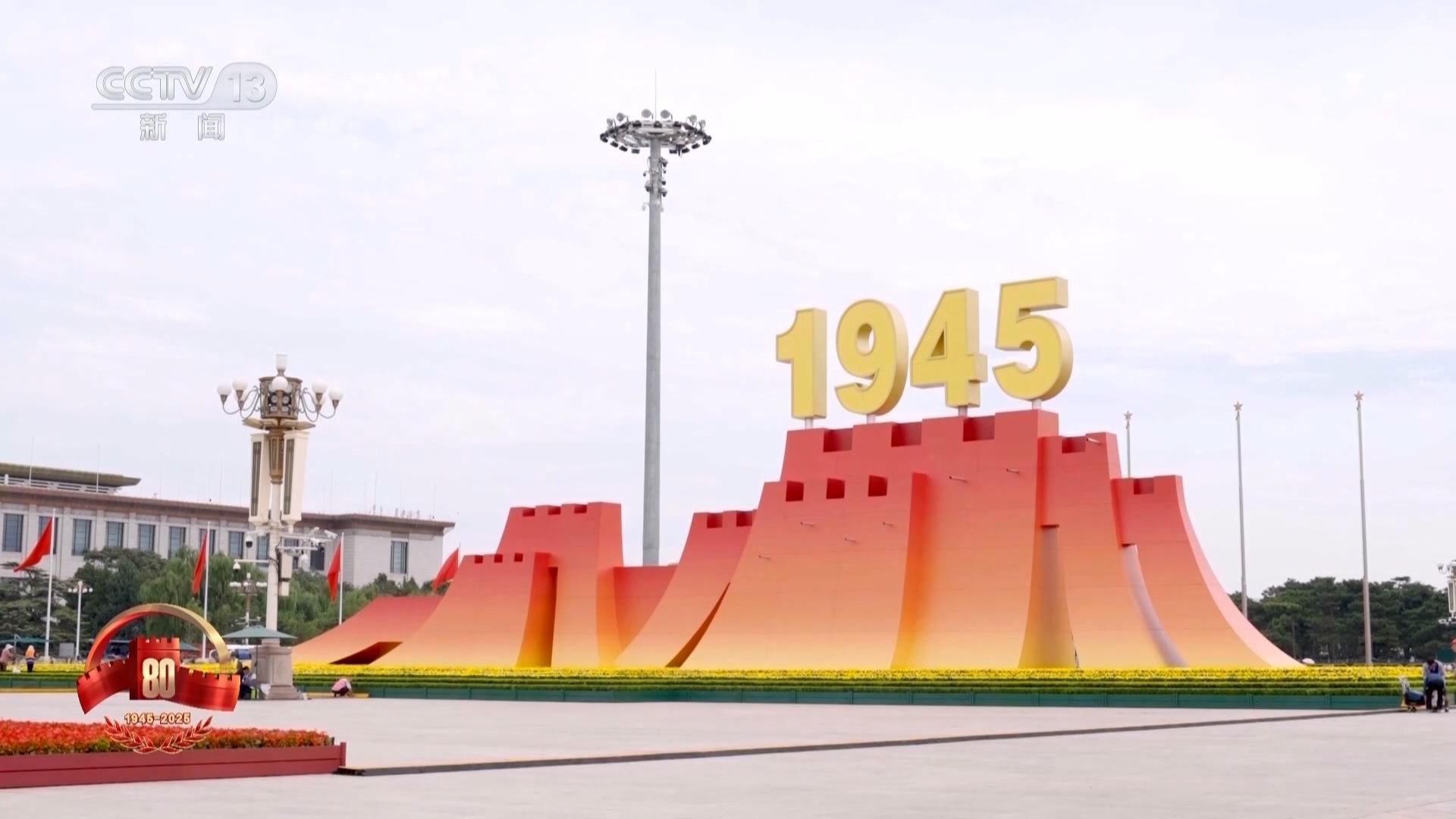 纪念活动现场,临时观礼台沿中轴线红毯呈“众”字形排布,延伸汇聚向人民英雄纪念碑。在人民英雄纪念碑的北侧,一座钢铁长城造型的年号台托举起“1945”“2025”两个金色年号。“众”和“城”作为此次纪念活动的主要设计元素,都在传递着同一个主题、同一种精神。