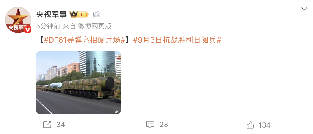 9月3日抗战胜利日阅兵,DF-61导弹亮相阅兵场。