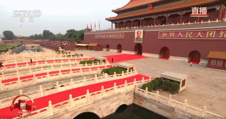 红毯覆桥仪仗肃立,这里的每一处细节都彰显着纪念大会的庄严与隆重。旭日东升,在朝阳的照射下,此刻的金水桥金辉荡漾,更加充满了仪式感。