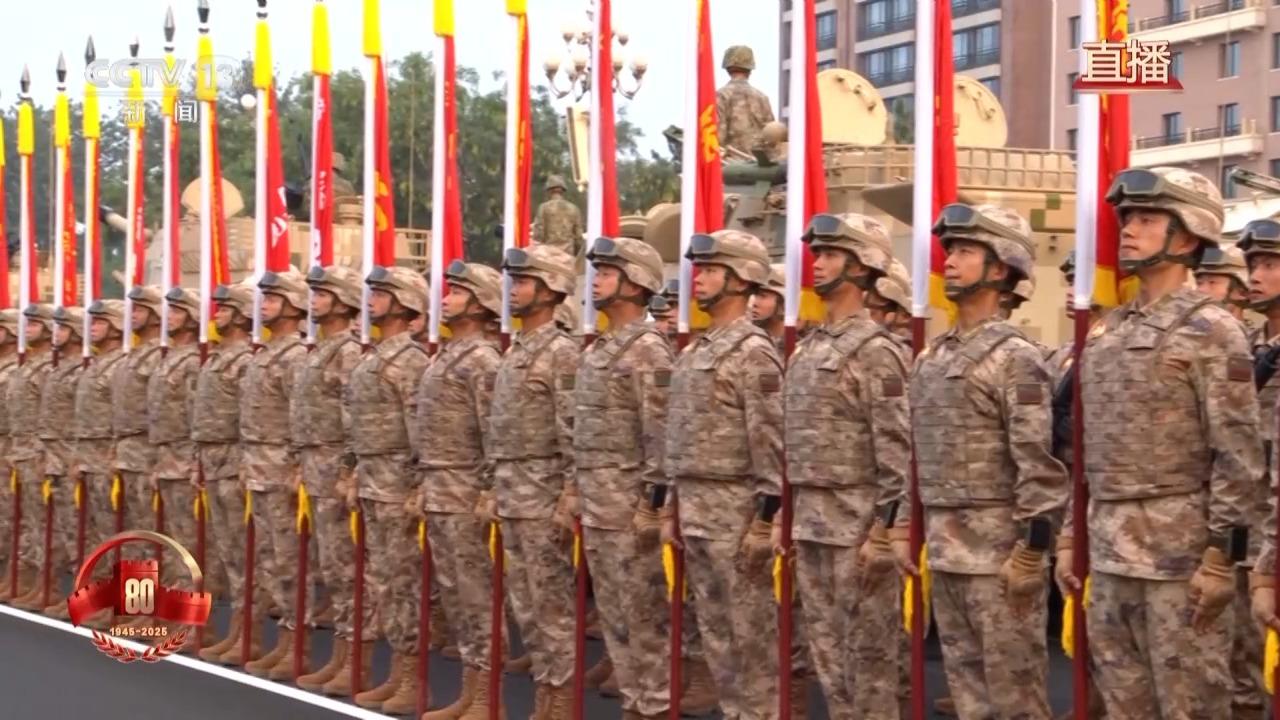 总台记者 刘洁:我现在所在的位置是东长安街,这里是受阅方队集结的地方。目前我们看到受阅方队已经集结完毕,官兵们正以昂扬的战斗姿态等待接受检阅。这次阅兵是由徒步方队、战旗方队、装备方队、空中梯队等组成的,我们用三个关键词介绍一下他们的特点。