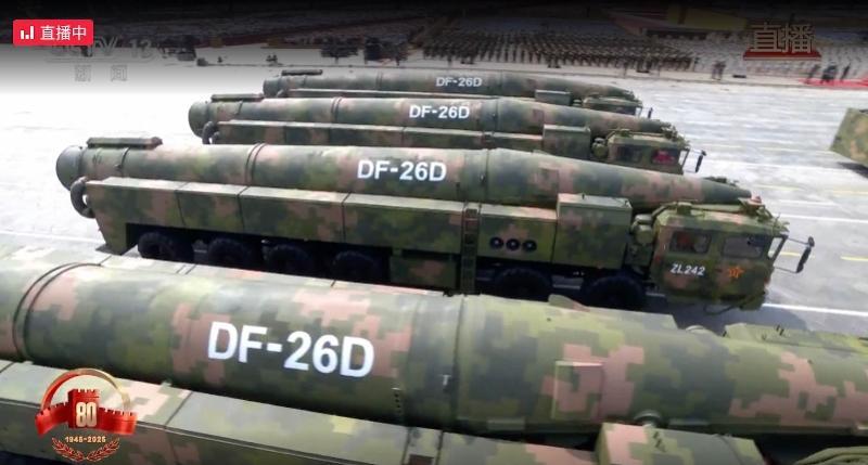 值得关注的是,此次亮相纪念中国人民抗日战争暨世界反法西斯战争胜利80周年阅兵的东风-26D弹道导弹是东风-26导弹的“升级版”。