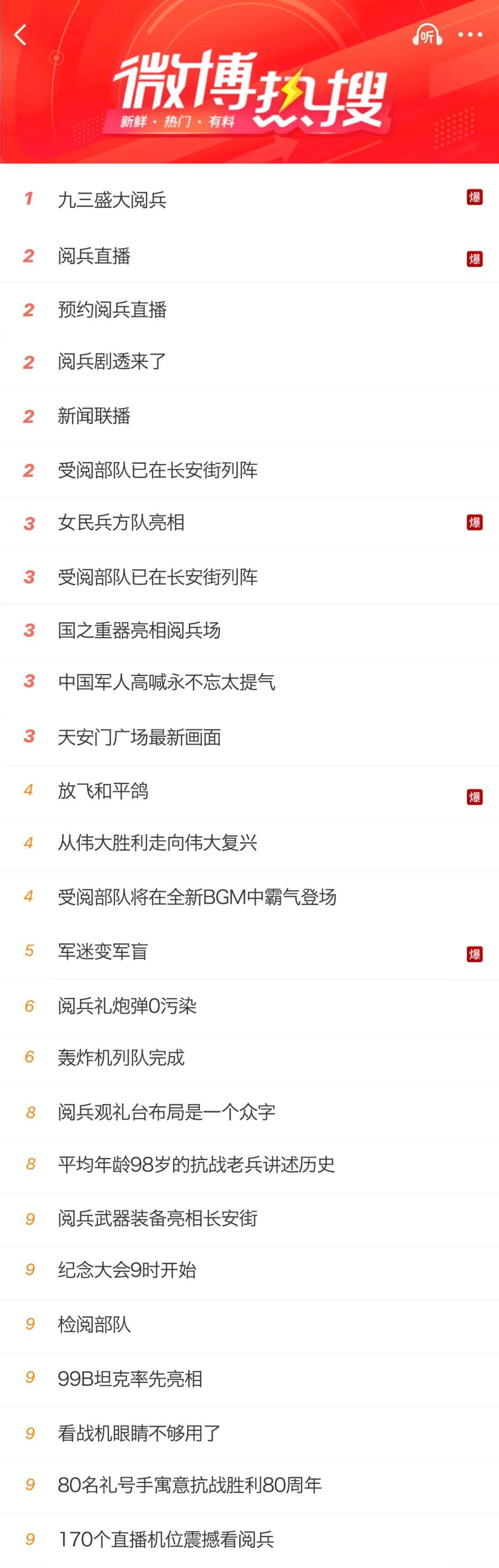 9月3日上午,纪念中国人民抗日战争暨世界反法西斯战争胜利80周年大会,在北京天安门广场隆重举行。此次阅兵,实现了多个“首次”,央视新闻全程直播九三阅兵。相关话题在社交平台热度不断。