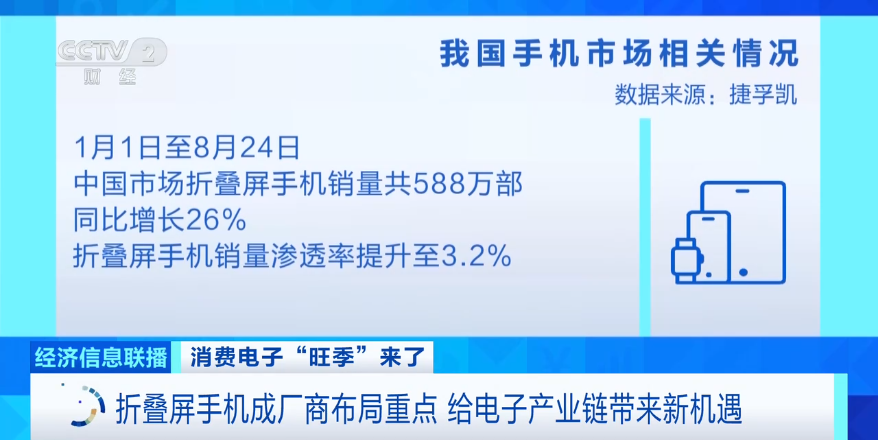 折叠屏正成为手机行业最具增长潜力的突破口,目前除苹果以外的主流手机厂商已发布多款折叠屏手机。国际市场研究公司捷孚凯最新监测数据显示,截至8月24日,今年中国市场折叠屏手机销量共588万部,同比增长26%,折叠屏手机销量渗透率提升至3.2%。