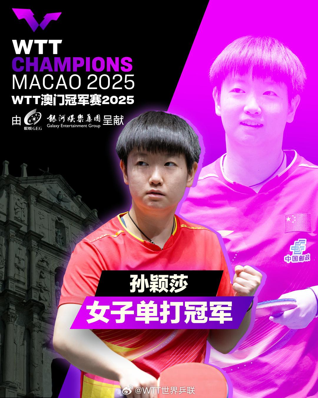 WTT澳门冠军赛女单决赛,孙颖莎和王曼昱上演高质量对决。双方大比分一度战至3比3平,最终,在决胜局中,孙颖莎11-6战胜王曼昱,夺得冠军!这是她本赛季斩获的第六个单打冠军。