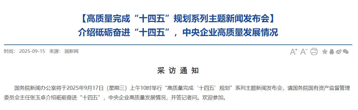 国务院新闻办公室将于2025年9月17日(星期三)上午10时举行“高质量完成‘十四五’规划”系列主题新闻发布会,请国务院国有资产监督管理委员会主任张玉卓介绍砥砺奋进“十四五”,中央企业高质量发展情况,并答记者问。