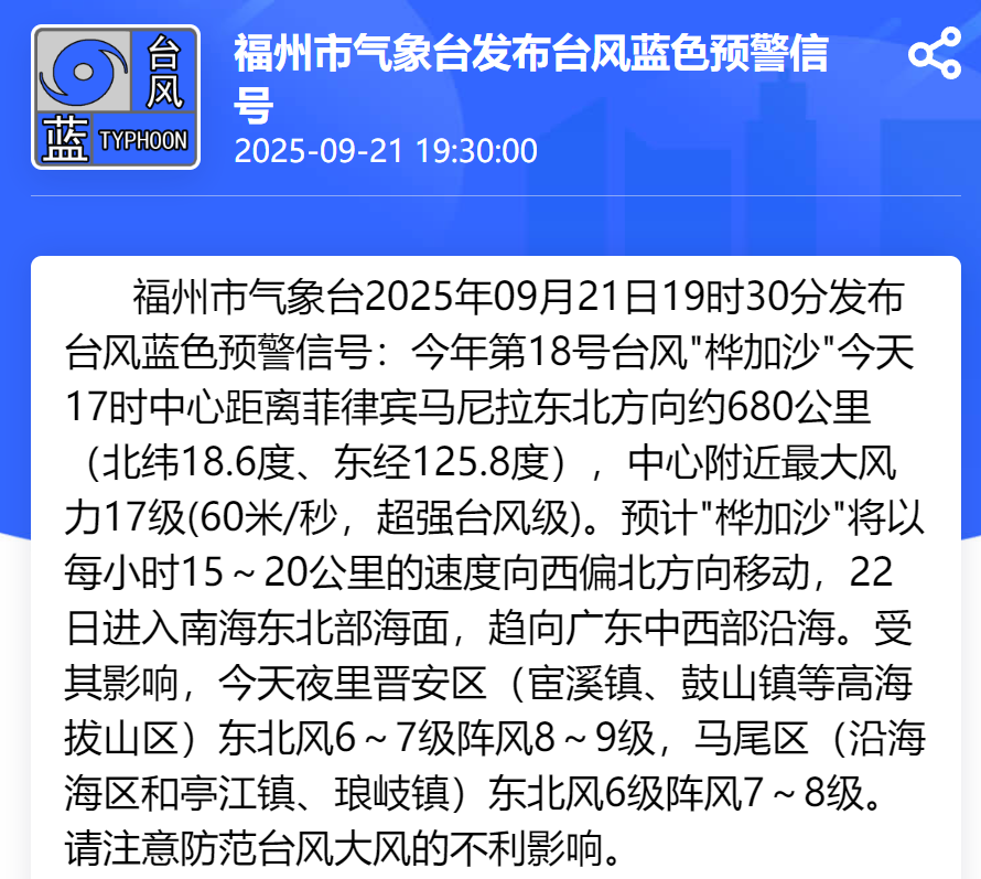 福州市气象台2025年09月21日19时30分发布台风蓝色预警信号:今年第18号台风"桦加沙"今天17时中心距离菲律宾马尼拉东北方向约680公里(北纬18.6度、东经125.8度),中心附近最大风力17级(60米/秒,超强台风级)。预计"桦加沙"将以每小时15~20公里的速度向西偏北方向移动,22日进入南海东北部海面,趋向广东中西部沿海。受其影响,今天夜里晋安区(宦溪镇、鼓山镇等高海拔山区)东北风6~7级阵风8~9级,马尾区(沿海海区和亭江镇、琅岐镇)东北风6级阵风7~8级。请注意防范台风大风的不利影响。