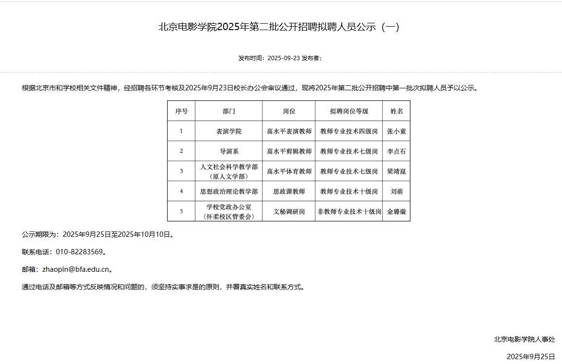 9月25日,北京电影学院人事处公示了北京电影学院2025年第二批公开招聘拟聘人员。