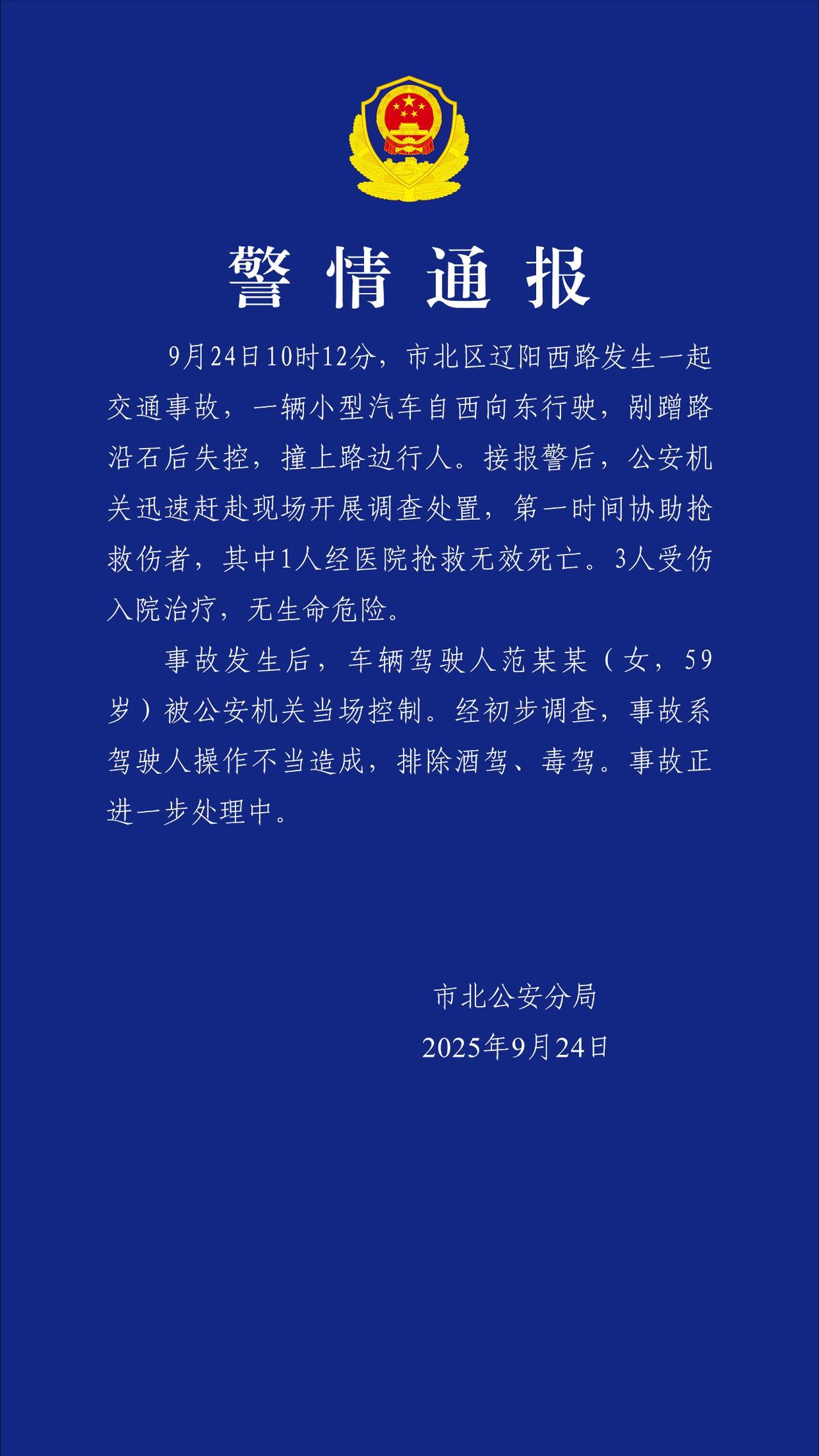9月24日10时12分,市北区辽阳西路发生一起交通事故,一辆小型汽车自西向东行驶,剐蹭路缘石后失控,撞上路边行人。接报警后,公安机关迅速赶赴现场开展调查处置,第一时间协助抢救伤者,其中1人经医院抢救无效死亡。3人受伤入院治疗,无生命危险。事故发生后,车辆驾驶人范某某(女,59岁)被公安机关当场控制。经初步调查,事故系驾驶人操作不当造成,排除酒驾、毒驾。事故正进一步处理中。