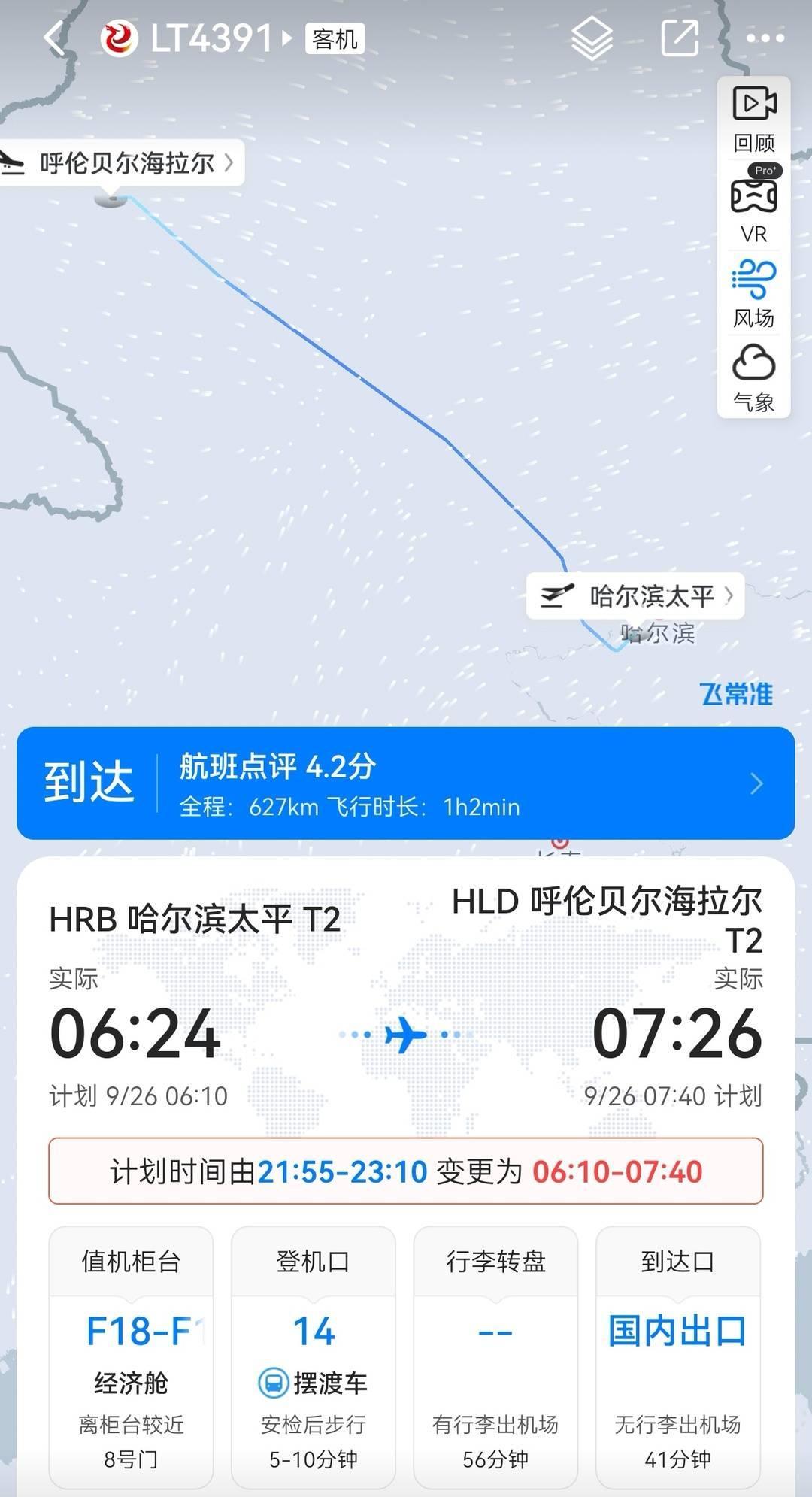 周女士原计划乘坐9月26日龙江航空由哈尔滨飞往呼伦贝尔海拉尔的LT4391航班,原定起飞时间为21点55分。然而,从周女士分享的订单截图可以看到,平台信息显示:“航空公司通知,起飞时间提前15小时45分钟。原航班起飞时间由21点55分调整至6点10分。”