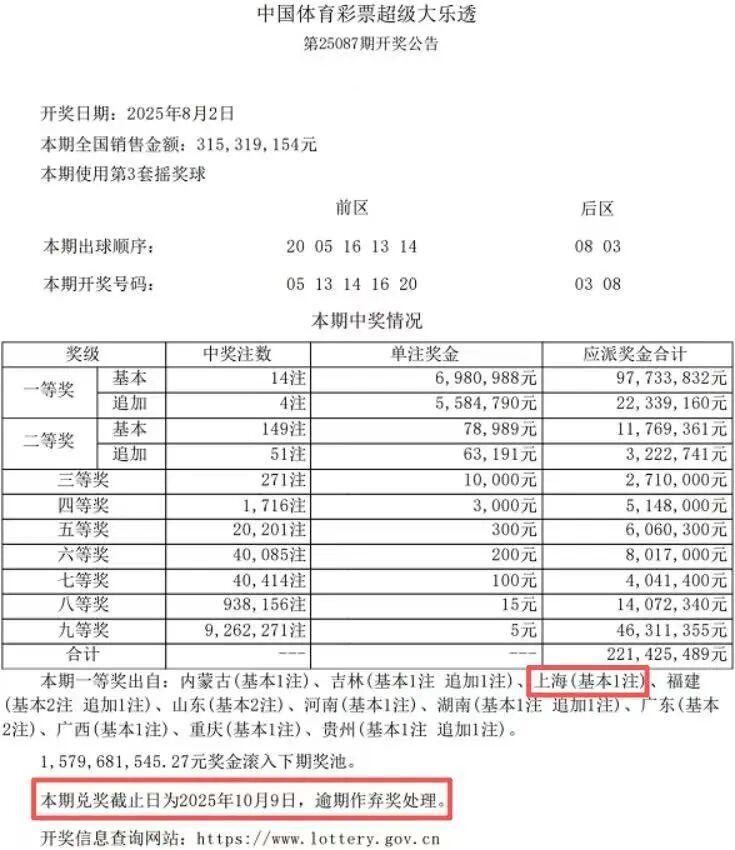 8月2日,超级大乐透第25087期开奖。前区开出号码05、13、14、16、20;后区开出号码03、08。当期上海开出1注基础一等奖,中奖彩票为一张金额42元的“7+2”复式票,单票奖金701万余元。该张大乐透一等奖彩票出自位于奉贤区航南公路5639-5699号3F(宝龙广场)的市属51907网点。该期大乐透兑奖截止时间为2025年10月9日。