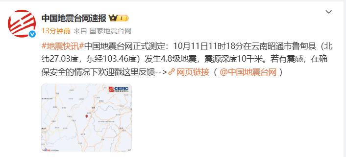 中国地震台网正式测定:10月11日11时18分在云南昭通市鲁甸县(北纬27.03度,东经103.46度)发生4.8级地震,震源深度10千米。