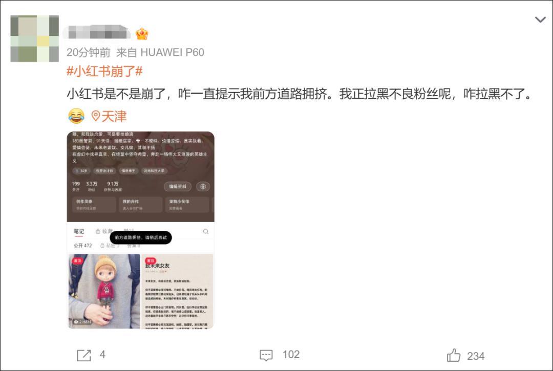 13日中午,有博主称小红书崩了,平台一直提示“前方道路拥挤,请稍后再试”。