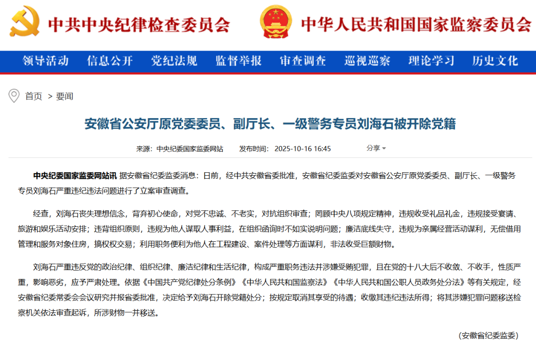 10月16日,据中央纪委国家监委网站消息:日前,经中共安徽省委批准,安徽省纪委监委对安徽省公安厅原党委委员、副厅长、一级警务专员刘海石严重违纪违法问题进行了立案审查调查。