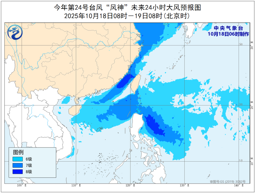 10月19日8时至20日8时,新疆东部、甘肃西部、内蒙古西部和东部偏南地区、辽东半岛、山东半岛、江苏东部沿海等地部分地区有5~6级风,阵风7~8级;黄海大部海域、东海西部海域、台湾海峡、巴士海峡、南海北部和中部的偏北部分海域、北部湾将有7~8级、阵风9级的大风,其中东海西南部海域、台湾海峡、南海东北部的部分海域风力可达9~10级、阵风11级。