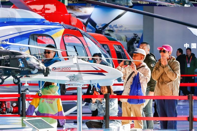 10月18日,在第七届中国天津国际直升机博览会上,观众在飞机模型前驻足观看。新华社发