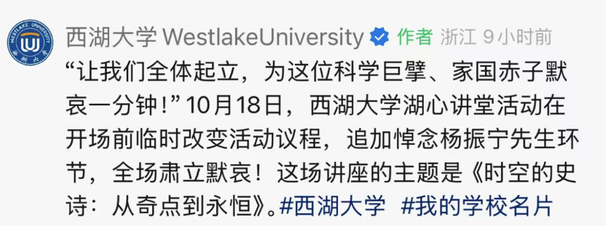 据西湖大学消息,10月18日,西湖大学湖心讲堂活动在开场前临时改变活动议程,追加悼念杨振宁先生环节,全场肃立默哀。
