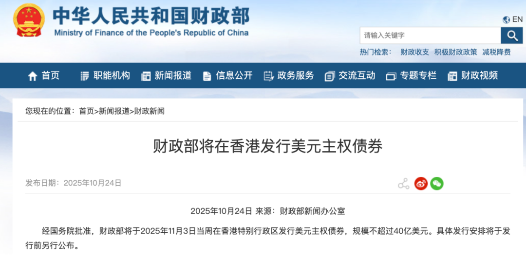 10月24日,经国务院批准,财政部将于2025年11月3日当周在香港特别行政区发行美元主权债券,规模不超过40亿美元。具体发行安排将于发行前另行公布。