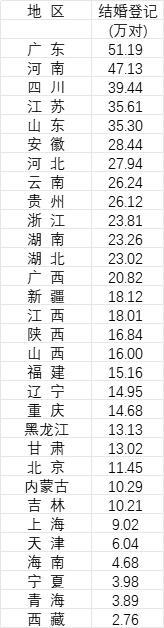 数据显示,去年我国结婚总人数最多的是广东省,为51.19万对,也是去年全国唯一一个结婚登记超过50万对的省份,且已连续三年位居全国第一。其中,去年广东初婚人数为83.19万人,再婚人数为19.19万人。