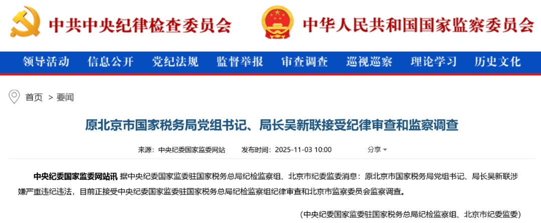 11月3日,中央纪委国家监委网站通报,据中央纪委国家监委驻国家税务总局纪检监察组、北京市纪委监委消息:原北京市国家税务局党组书记、局长吴新联涉嫌严重违纪违法,目前正接受中央纪委国家监委驻国家税务总局纪检监察组纪律审查和北京市监察委员会监察调查。