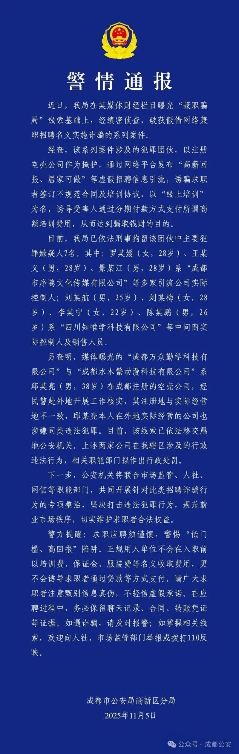 据微信公众号“成都公安”消息,11月5日,成都市公安局高新区分局发布警情通报: