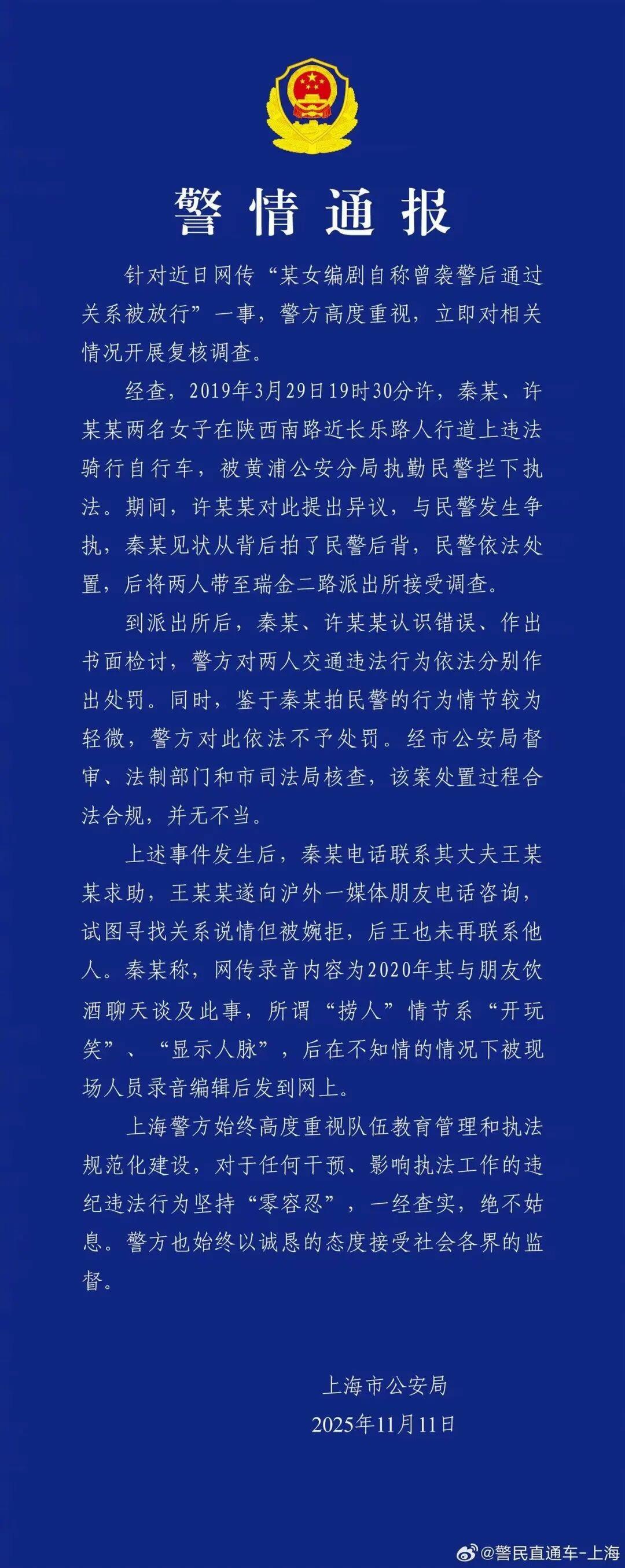 11月11日,针对近日网传“某女编剧自称曾袭警后通过关系被放行”一事,上海市公安局发布警情通报,详情如下: