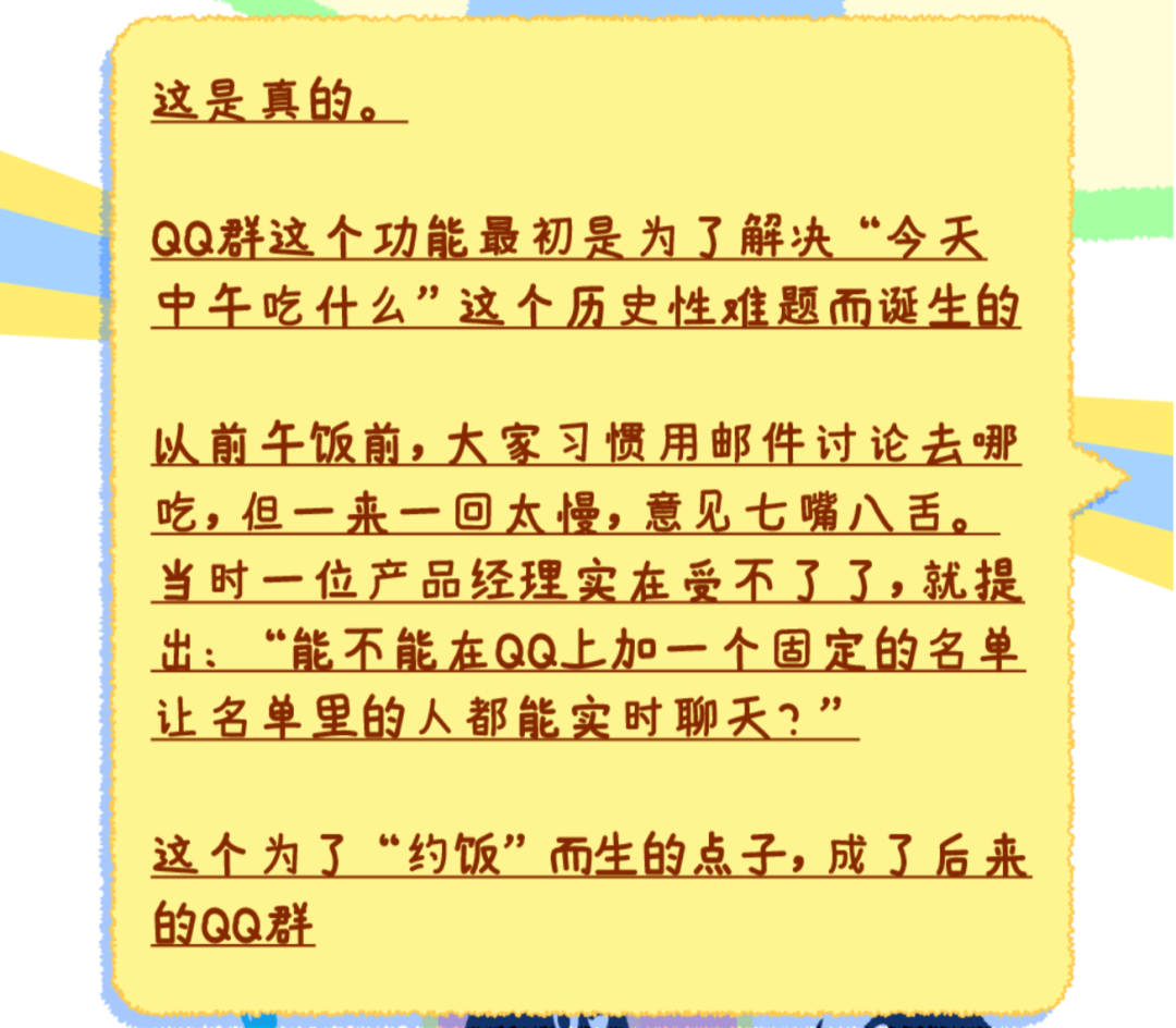 官方介绍称:“QQ群这个功能最初是为了解决‘今天中午吃什么’这个历史性难题而诞生的。以前午饭前,大家习惯用邮件讨论去哪吃,但一来一回太慢,意见七嘴八舌。当时一位产品经理实在受不了了,就提出:‘能不能在QQ上加一个固定的名单让名单里的人都能实时聊天?’这个为了‘约饭’而生的点子,成了后来的QQ群。”