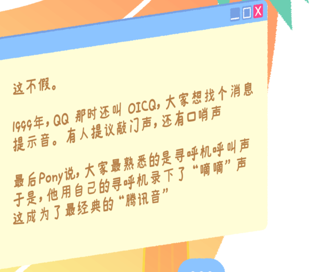 官方介绍道:“1999年,QQ那是还叫OICQ,大家想找个消息提示音。有人提议敲门声,还有口哨声。最后Pony(马化腾)说,大家最熟悉的是寻呼机的呼叫声,于是他用自己的寻呼机录下了“滴滴声,这成为了最经典的‘腾讯音’。”