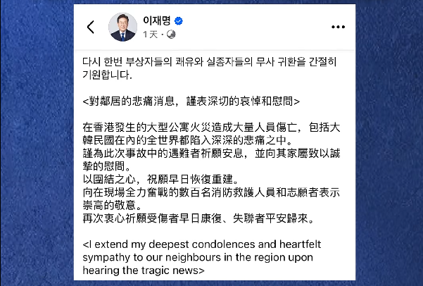 李在明以韩文、中文和英文发表帖文表示,此次火灾造成重大人员伤亡,包括韩国在内的全世界都陷入深深的悲痛之中。他谨为此次事故的遇难者祈福,祈愿逝者安息,并向其家属致以诚挚慰问。他表示将以团结之心,祝愿早日恢复重建。他还表示,向在现场全力奋战的数百名消防救护人员和志愿者致以崇高敬意,并再次衷心祈愿伤者早日康复、失联者平安归来。