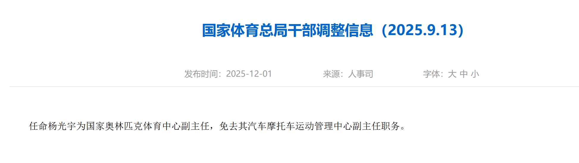 任命杨光宇为国家奥林匹克体育中心副主任,免去其汽车摩托车运动管理中心副主任职务。